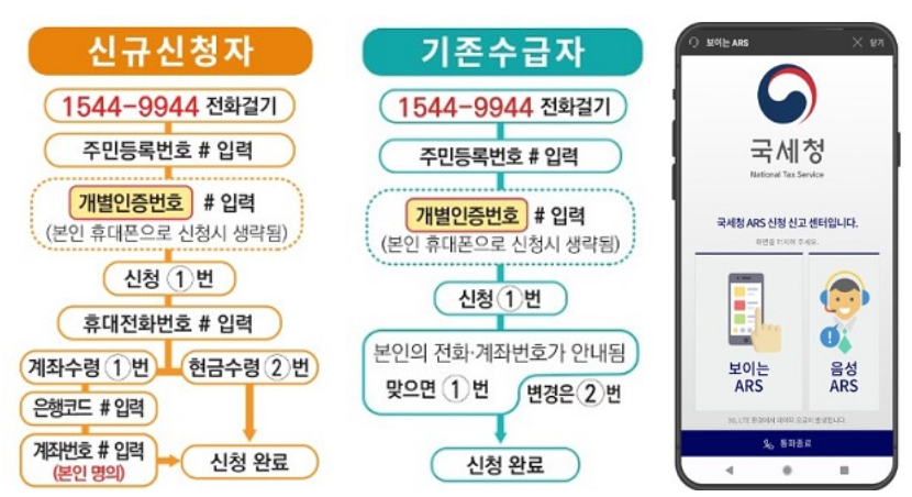 - 기존 수급자: 1544-9944 → 주민등록번호 # → 개별인증번호 # → 신청 ①번